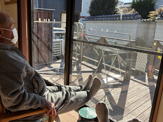ガラス越しの日向ぼっこリハビリ 2025年12月5日 | カテゴリー: 八雲ゆ楽デイサービス デイサービスには南向きに大きなウッドデッキがあり晩秋の木々を眺めながら、日向ぼっこ&リハビリ体操「気持ちがいいね」そんな言葉が自然と出てきます